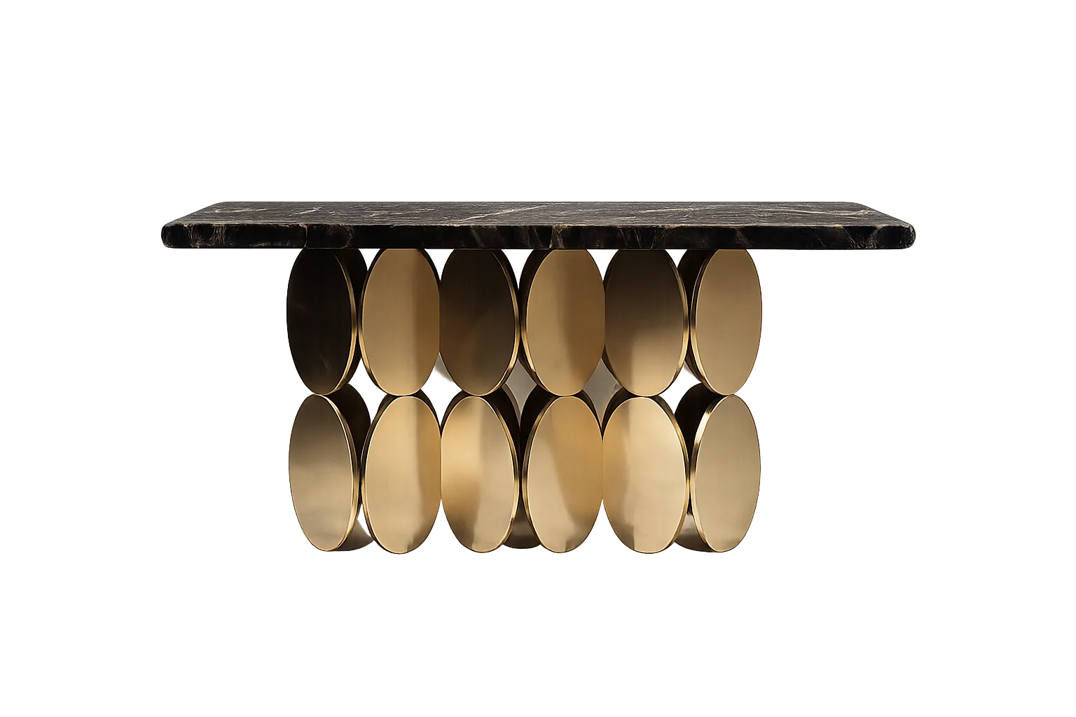 A striking luxury console in marble top set on a base of polished gold metal oval discs. The combination creates a glamorous statement. Size: 5′ x 18″