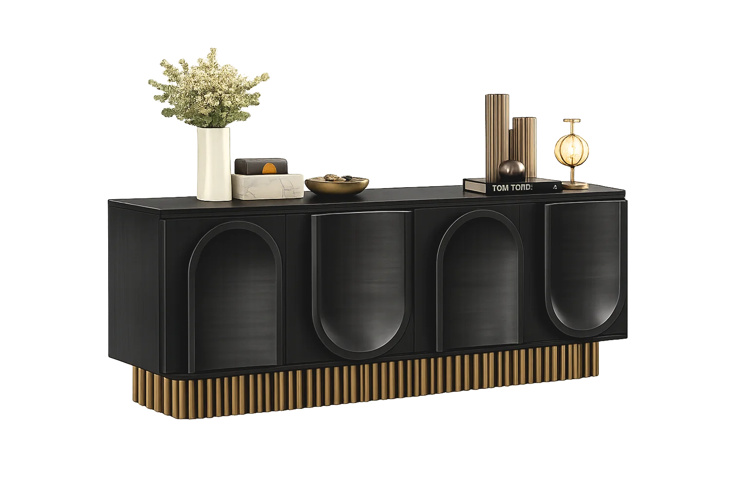 A statement sideboard featuring a sleek matte black body with sculpted arched panel detailing, elevated on a striking fluted metallic gold base. Size: 6′ x 18″