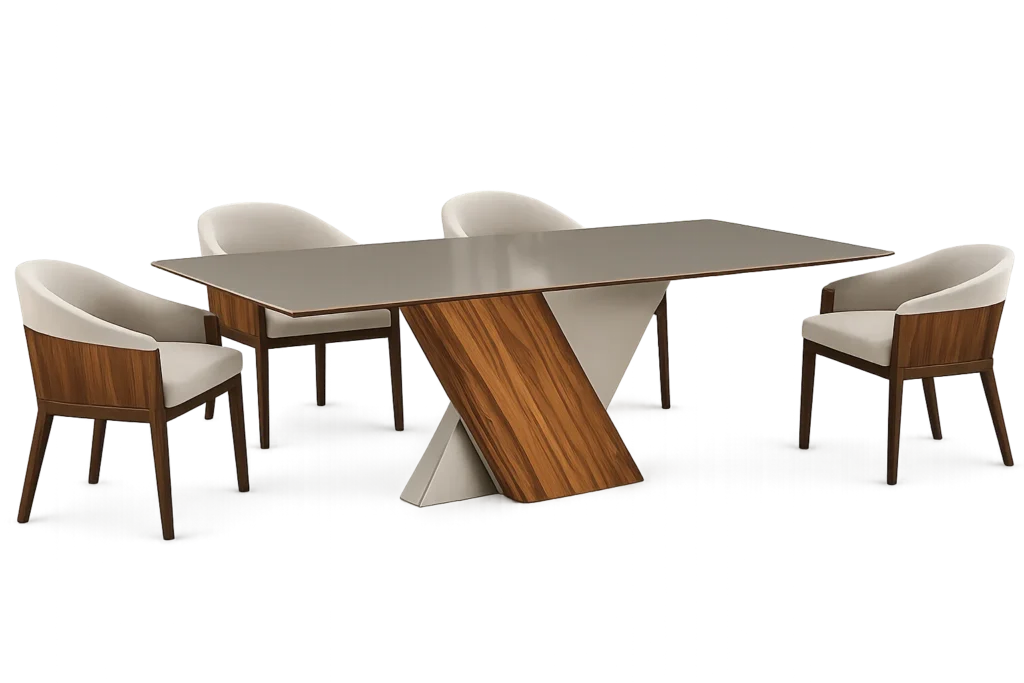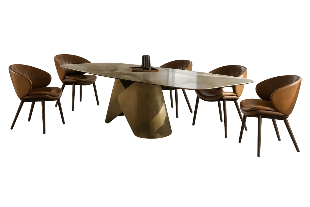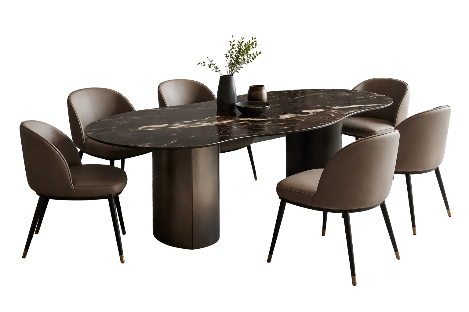 Contemporary dining with a sleek marble oval top supported by bold cylindrical pedestal bases. Paired with premium leather fabric chairs. 8 Person dining