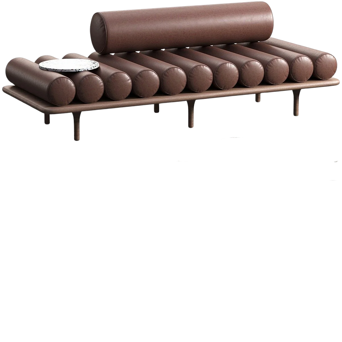 A sleek settee structured with dark wood base & distinctive leather strap accent detail. Supported on solid wooden legs with subtle brass caps. Size: 4′ x 18″