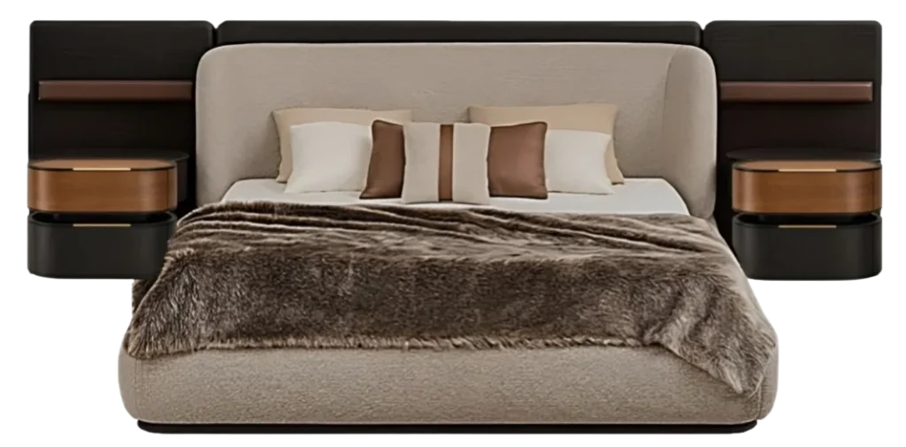 A plush, fully upholstered & stitched statement bed with a curved wraparound headboard and smooth cylindrical side tables. King Size Bed with 2 Side Tables