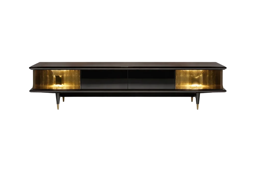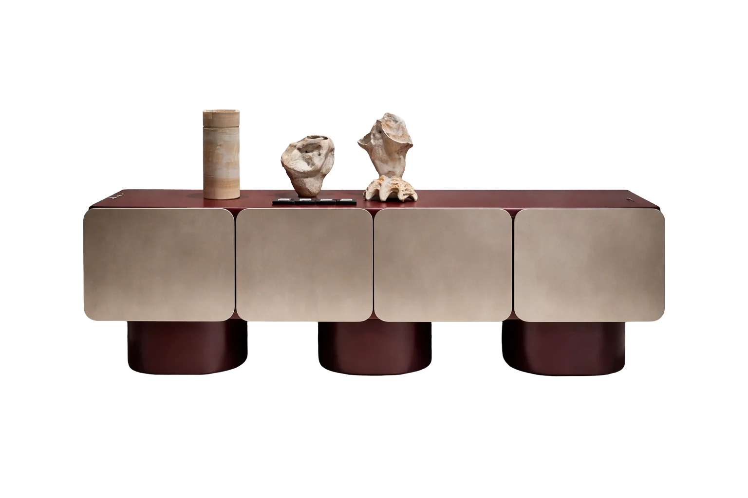 A stylish TV unit featuring a smooth matte metal-clad front with softly rounded panels, contrasted by a rich wood top & round wooden supports. Size: 7′ x 18″