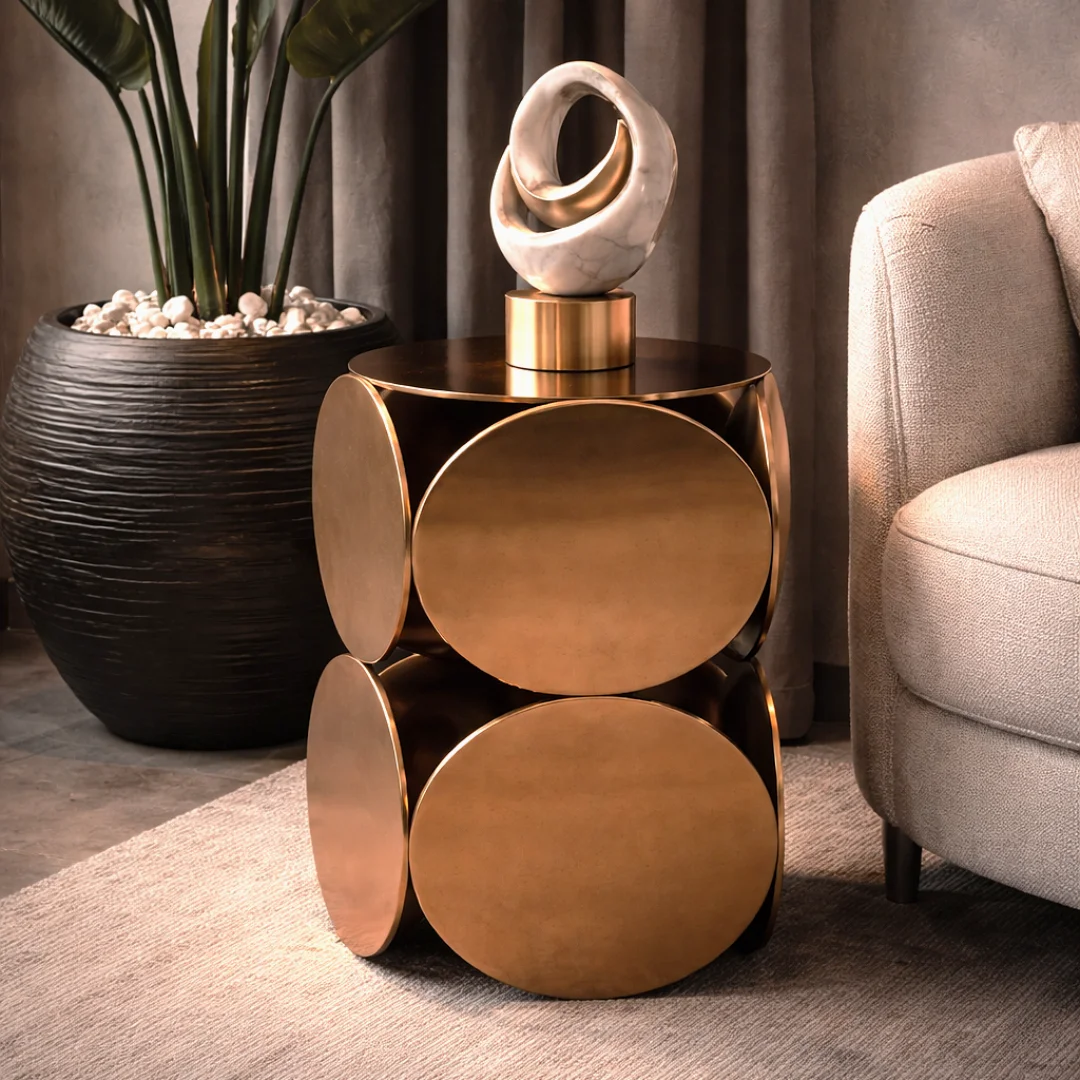 A striking corner table in a bold geometric design with stacked circular metal panels. Finished in a warm brushed gold tone. Size: 18” x 18”