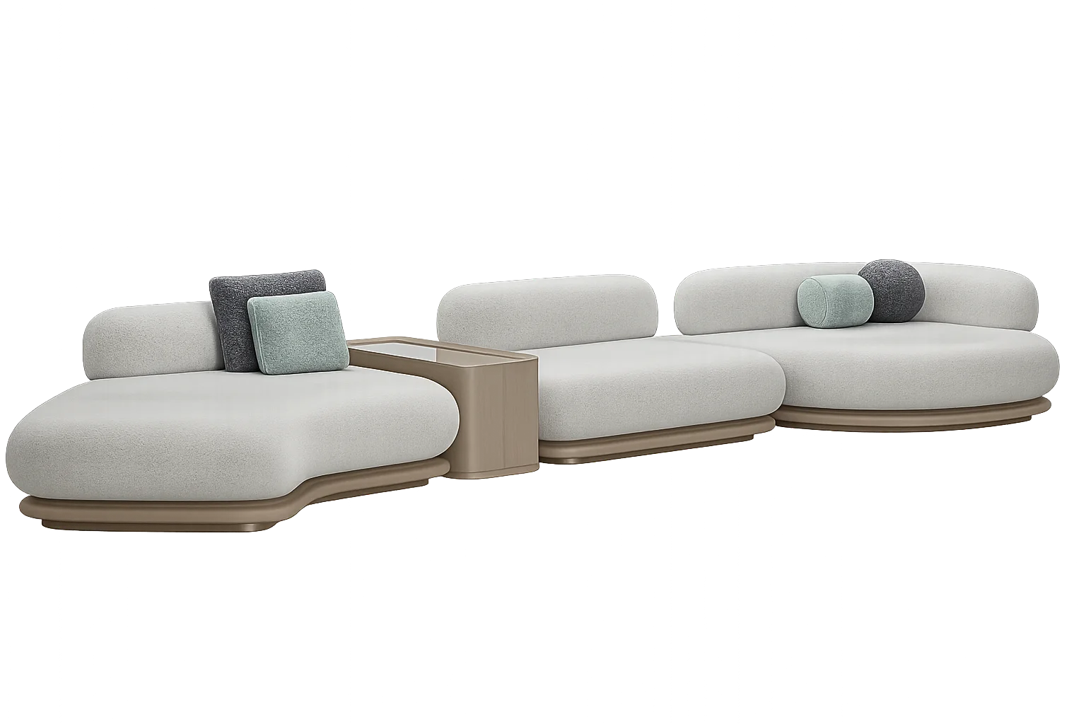 Modern modular curved sofa featuring fluffy rounded forms with an integrated wooden console & base for added functionality. 6 Seater sofa