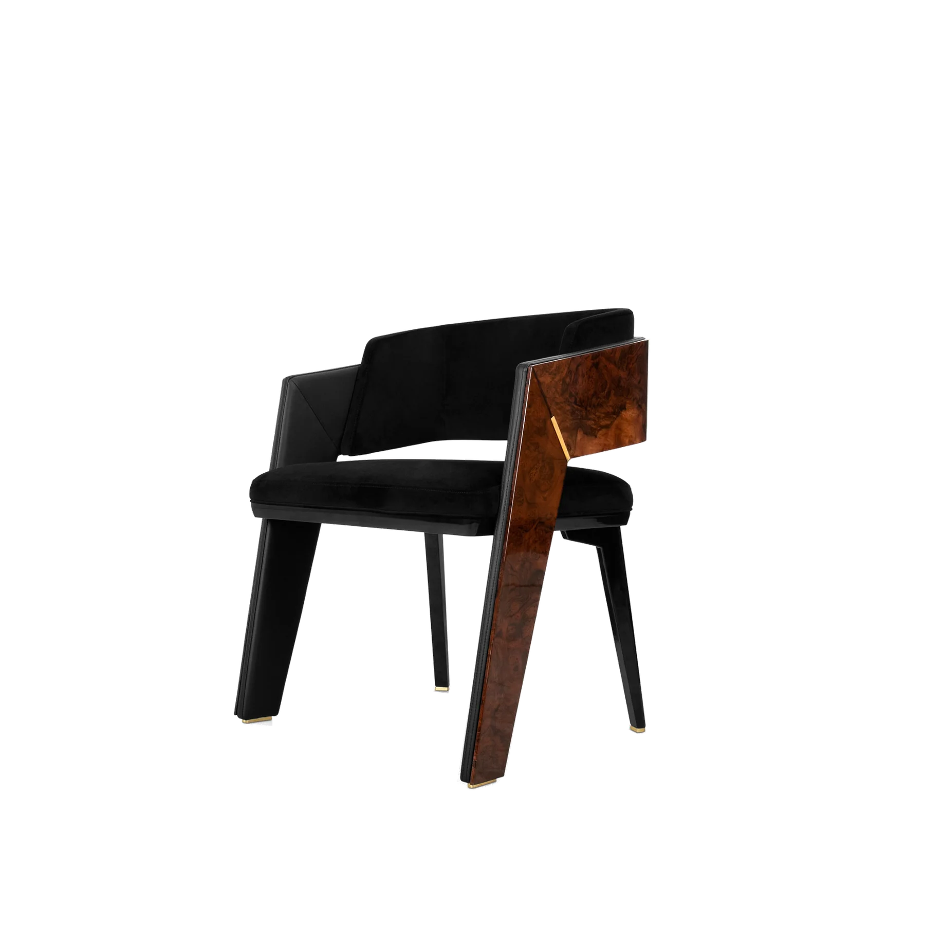 A modern dining chair with a sleek upholstered seat & backrest paired with a striking high-gloss burl wood veneer arm panel & tapered legs. Each