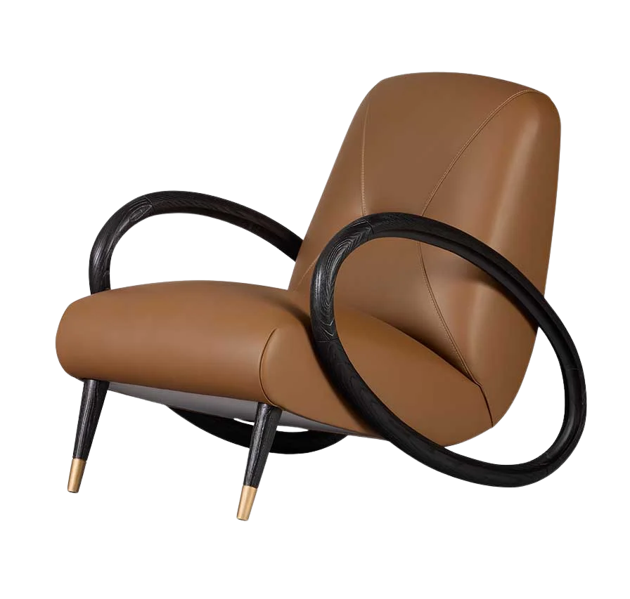 Sleek lounge chair in smooth leatherette, featuring sculptural circular wood arms supported by tapered wooden legs with metal tips. Pair of Chairs