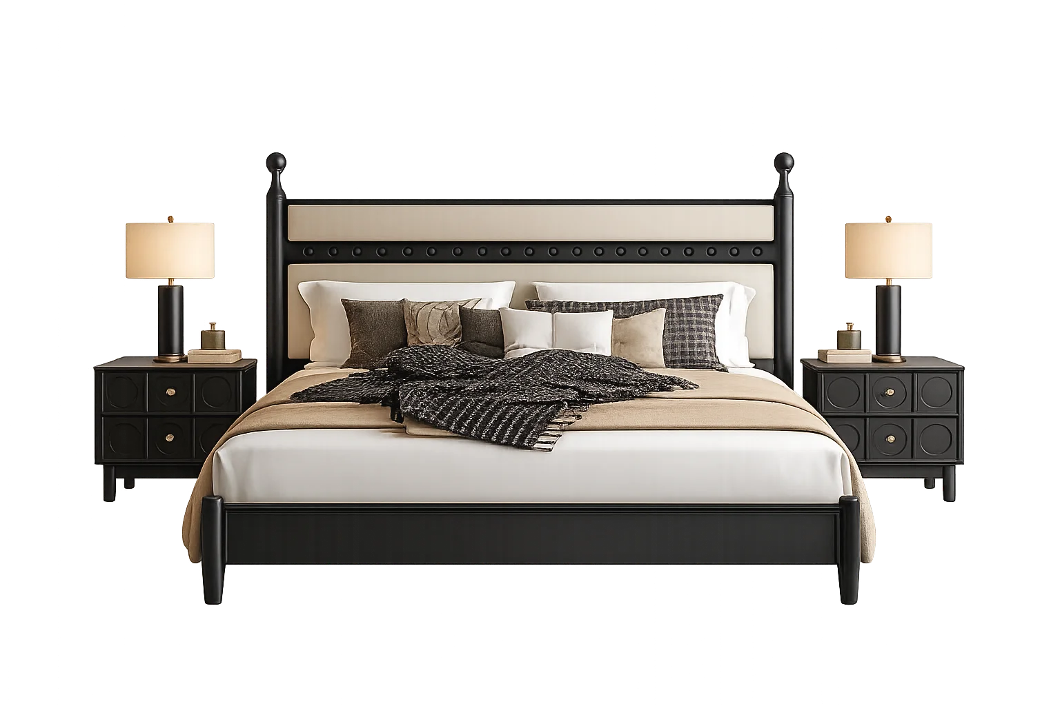 Classic statement bed crafted with a bold black wooden frame and an upholstered panel headboard accented with refined stud detailing. King Size Bed with 2 Side Tables