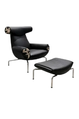 Designer lounge chair in premium black leather accented with bold patterned side panels. Base in sleek stainless-steel legs, Single Chair with Footrest