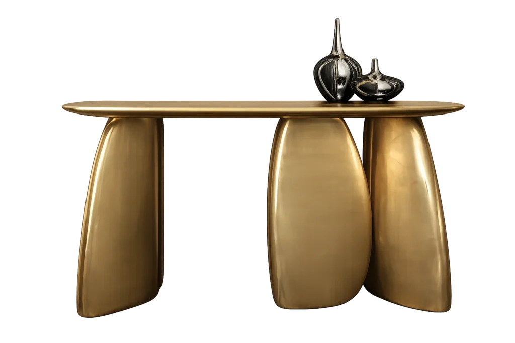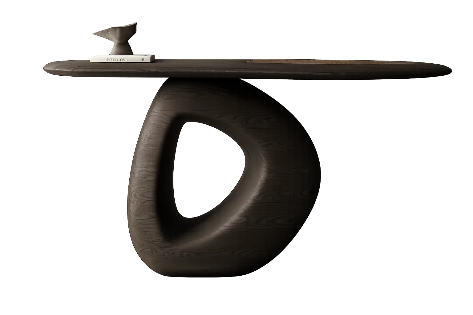 A sculptural console featuring an oval top supported by a distinctive hollow organic-shaped base in dark opengrain matte finish. Size: 4′ x 18″