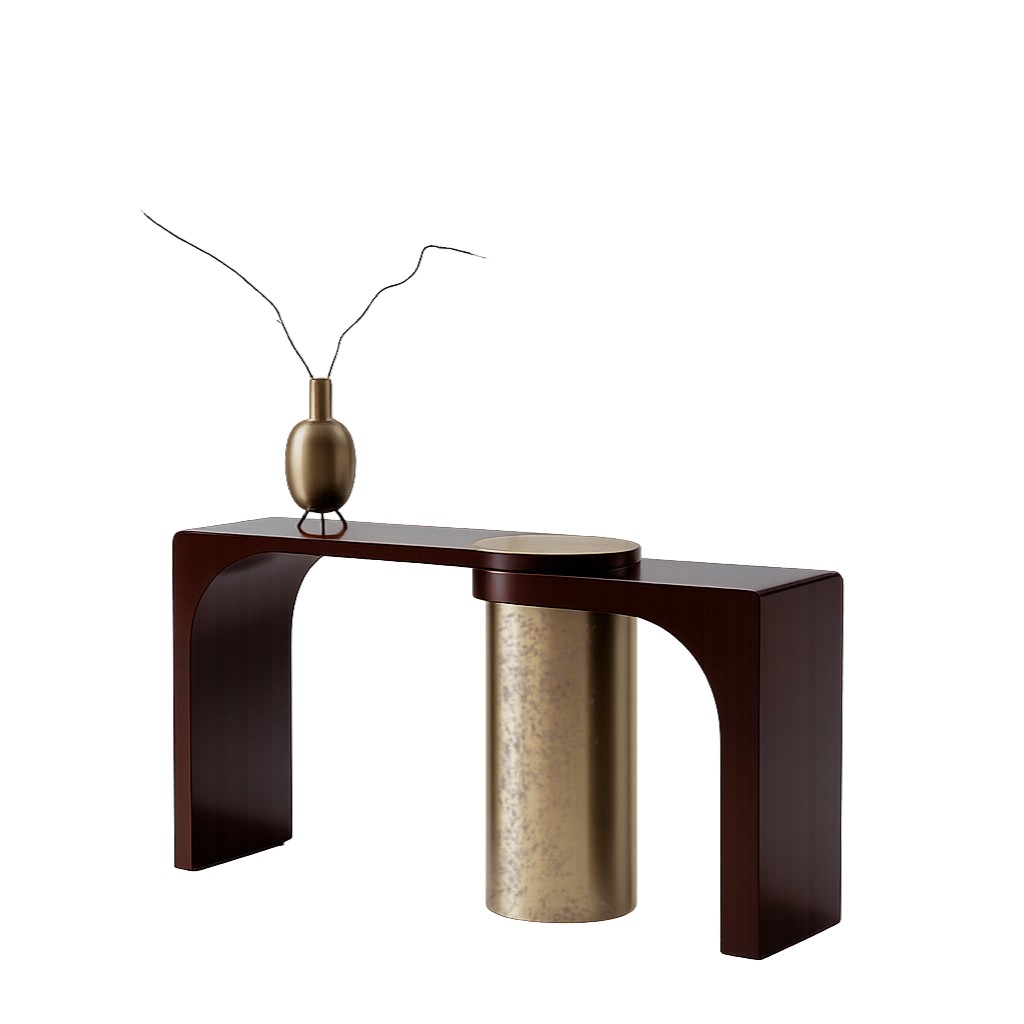 An artistic console in layered top supported by cylindrical triple bases. Its a combination of high gloss polished burgundy & brushed gold accents creating a bold statement piece.
