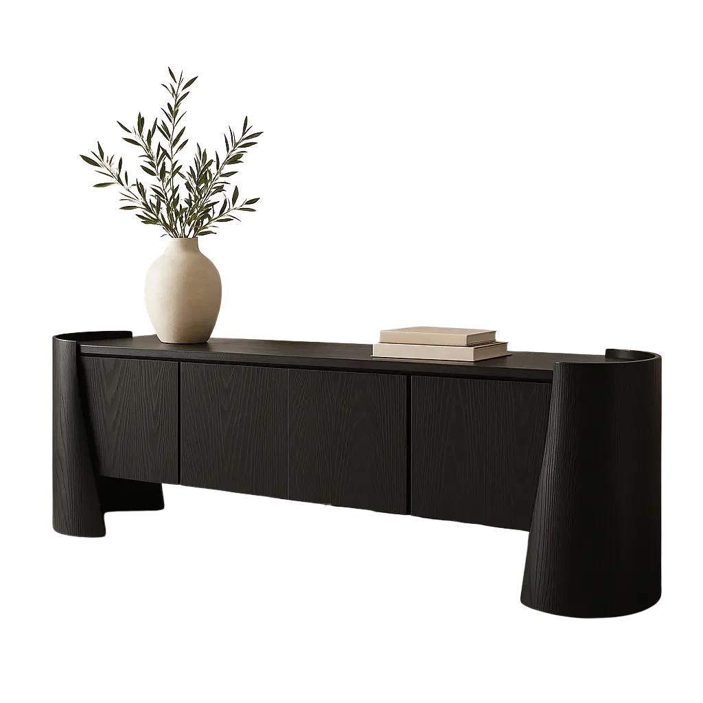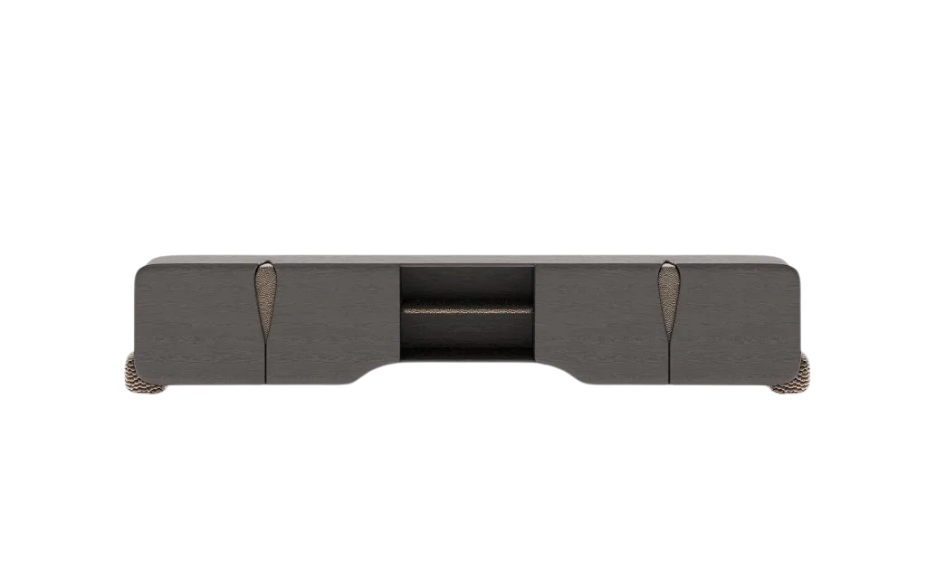 A luxurious TV unit featuring a rich dark body with intricately textured front panels elevated on solid marble block legs making it high-end piece. Size: 7′ x 18″