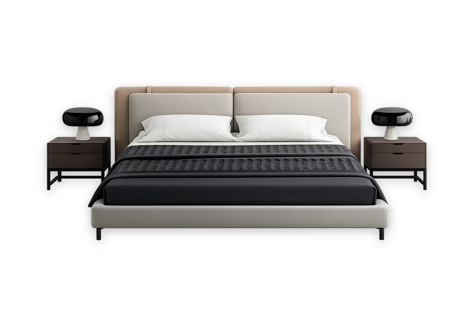 Modern bed featuring a dual-panel buckle cushioned headboard with subtle contrasting tones for a sleek, contemporary appeal. King Size Bed with 2 Side Tables