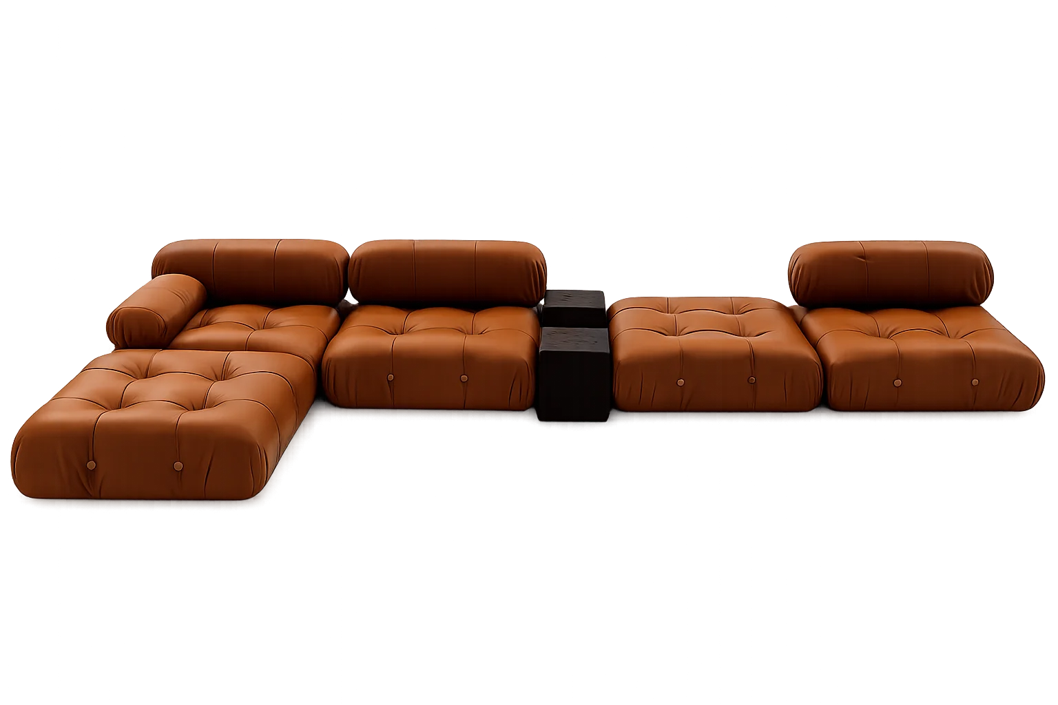 Luxurious modular L-shape sofa in rich cognac leather with deep tufted cushioning. It has a low-profile design with an integrated midi table. 6 Seater Sofa