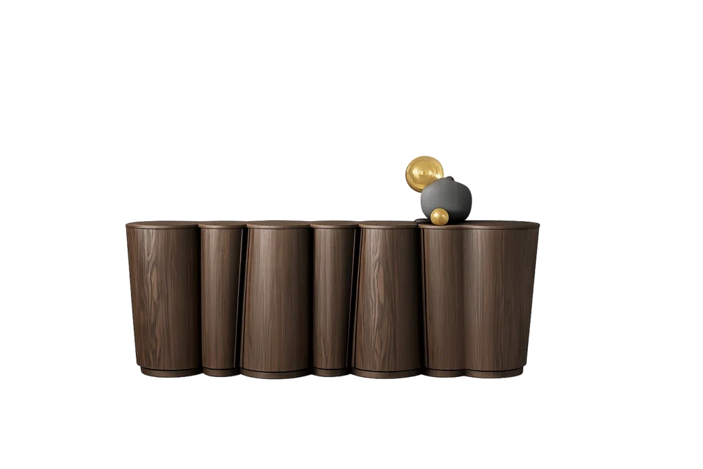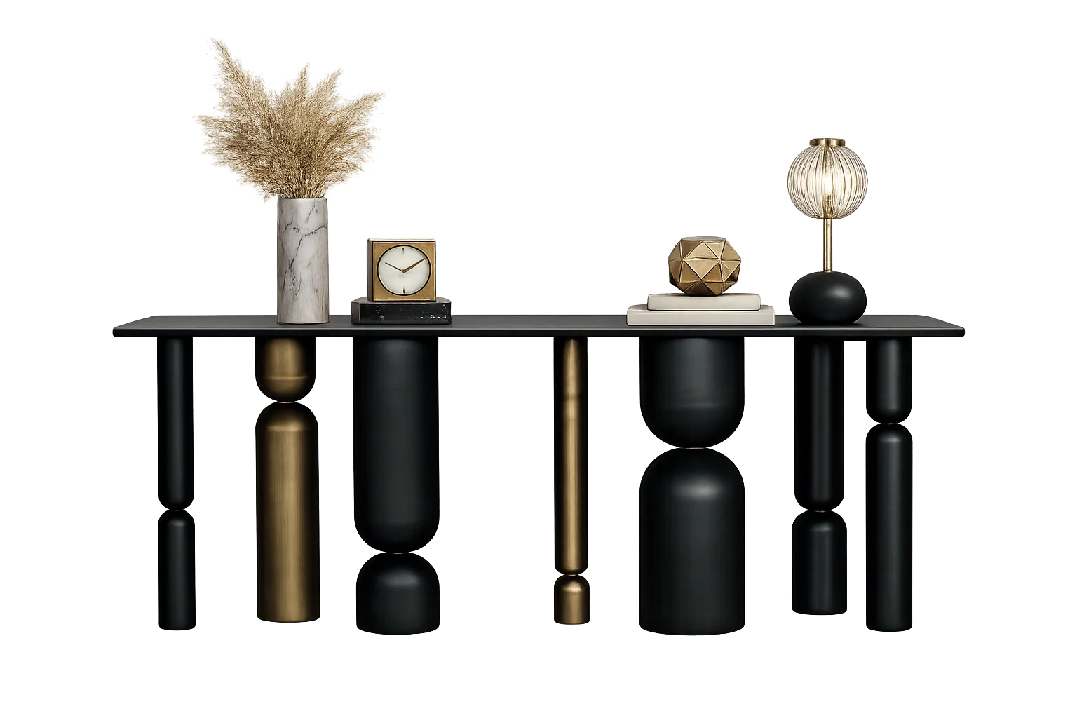 A striking console in a matte black top supported by an artistic arrangement of sculptural cylindrical legs in opengrain & brushed gold antique finishes. Size: 6′ x 18″