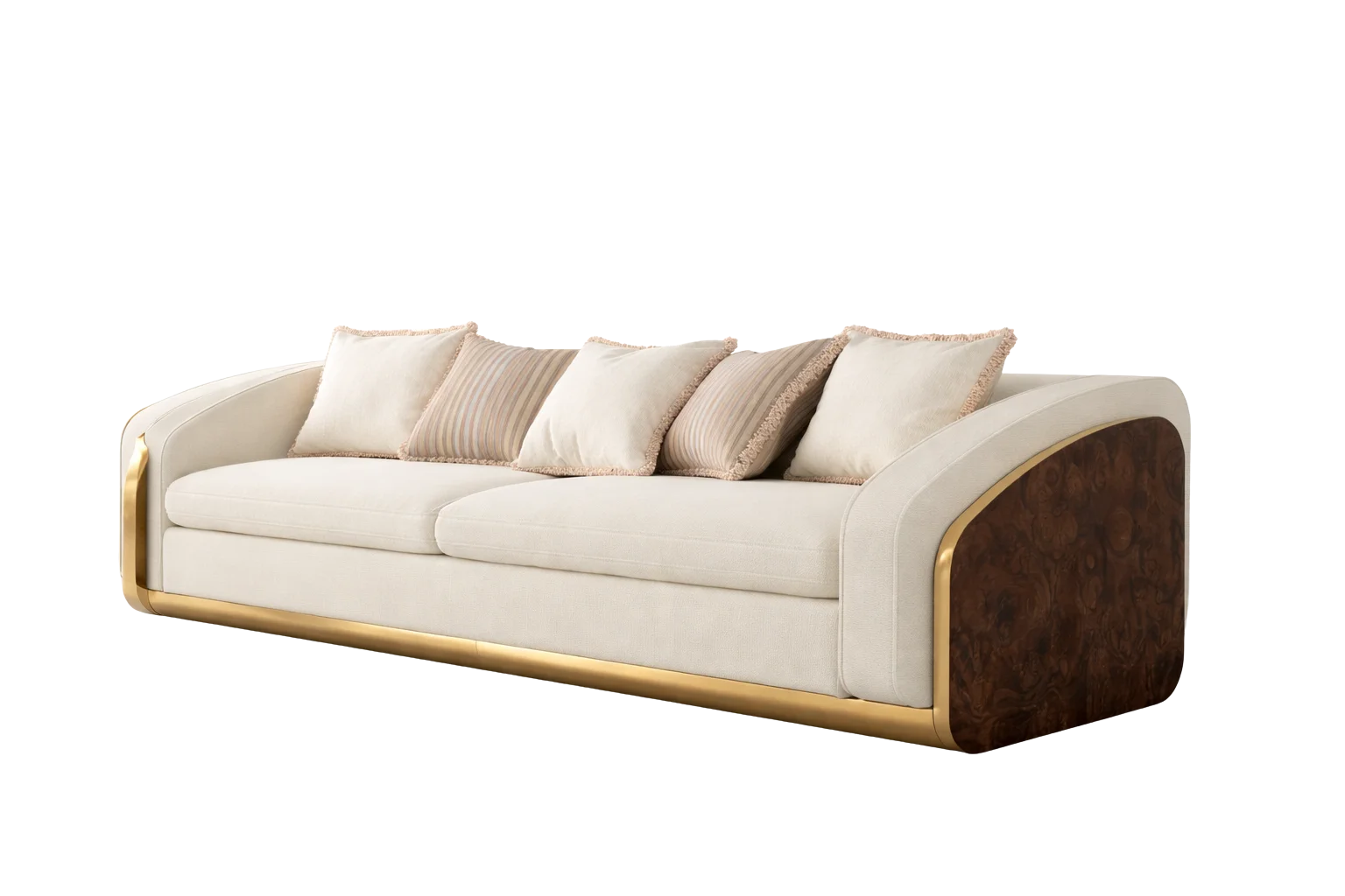Luxurious sofa upholstered in soft premium fabric, complemented by rich walnut veneer side panels and brushed gold metal accents. 3 Seater Sofa