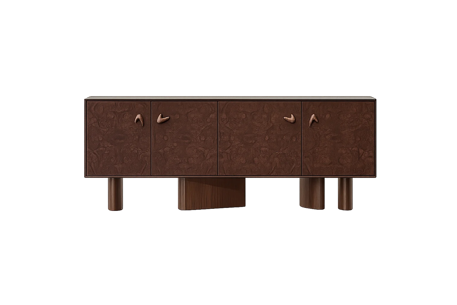 A distinctive sideboard crafted in rust-toned mahogany wood veneer front. Supported on solid cylindrical wooden legs, with designer handles. Size: 6′ x 18″