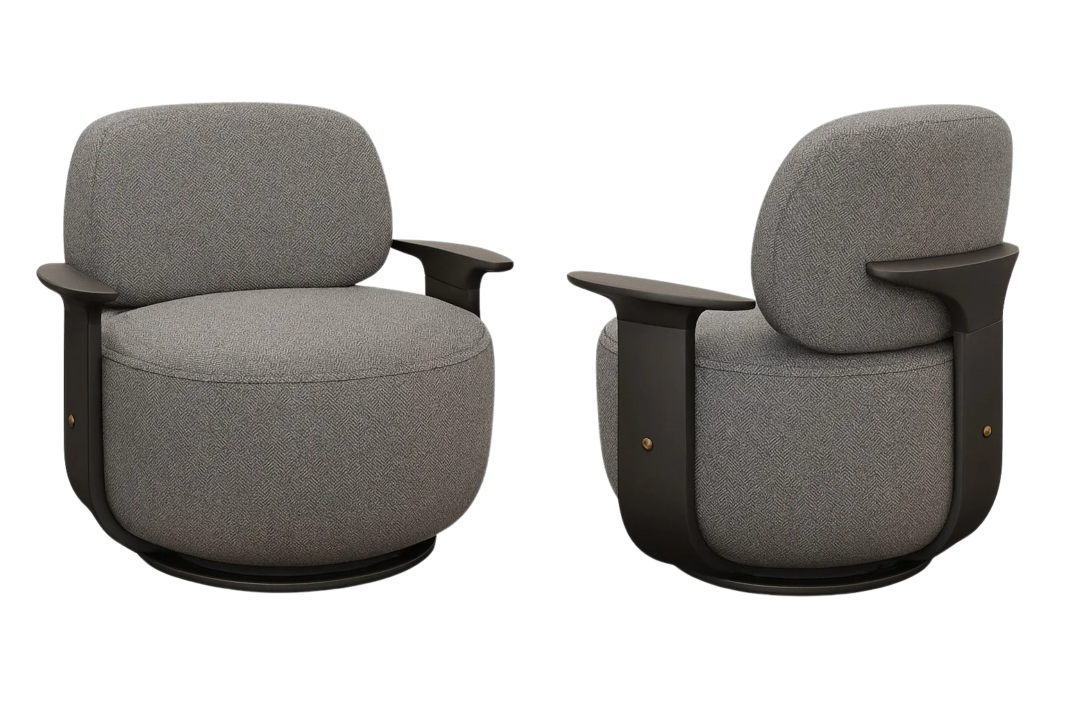 Modern swivel chair upholstered in premium textured fabric with smooth dark wood arm panels for a refined contrast. Pair of Chairs