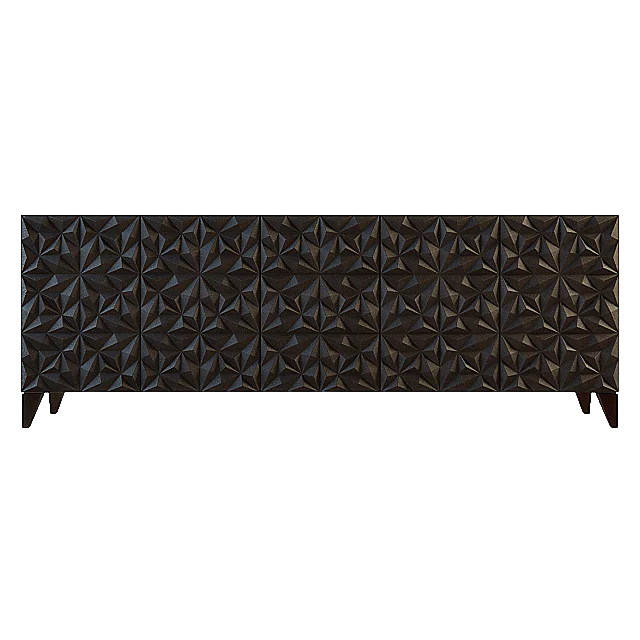 A statement TV unit crafted in intricately carved geometric 3D front panels for a bold textured appeal. Supported on sleek tapered legs. Size: 7′ x 18″