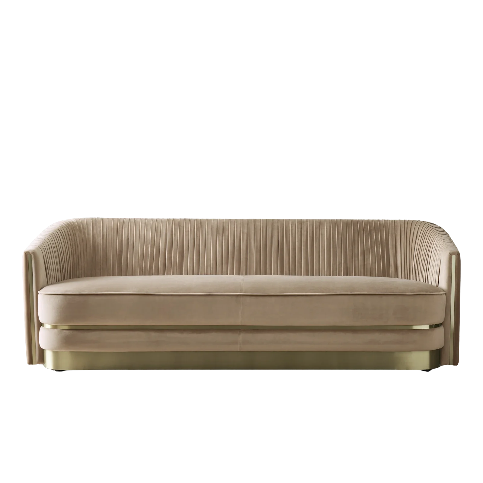 Sophisticated sofa with a gracefully curved backrest in vertical channel tufting accented with subtle metallic detailing in the base and arms. 3 Seater sofa